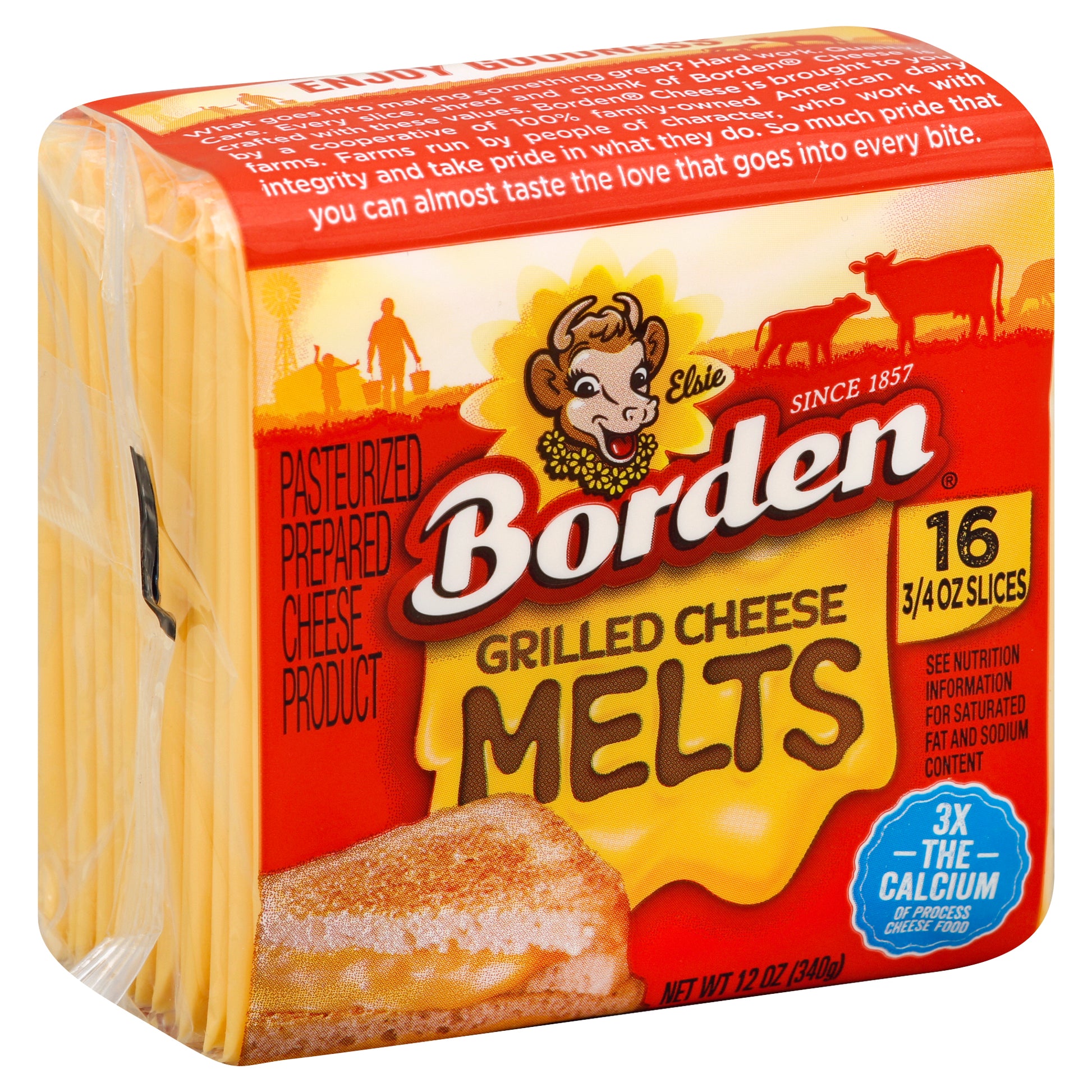 Since 1857. See nutrition information for saturated fat and sodium content. 3X the calcium of process cheese food. Enjoy Goodness: What goes into making something great? Hard work. Quality. Care. Every slice, shred and chunk of Borden Cheese is crafted with these values. Borden Cheese is brought to you by a cooperative of 100% family-owned American dairy farms. Farms run by people of character, who work with integrity and take pride in what they do. So much pride that you can almost taste the love that goes into every bite. Gluten free. If you are not completely satisfied, please contact us at 1-888-337-2407 or www.BordenCheese.com. Made in USA.