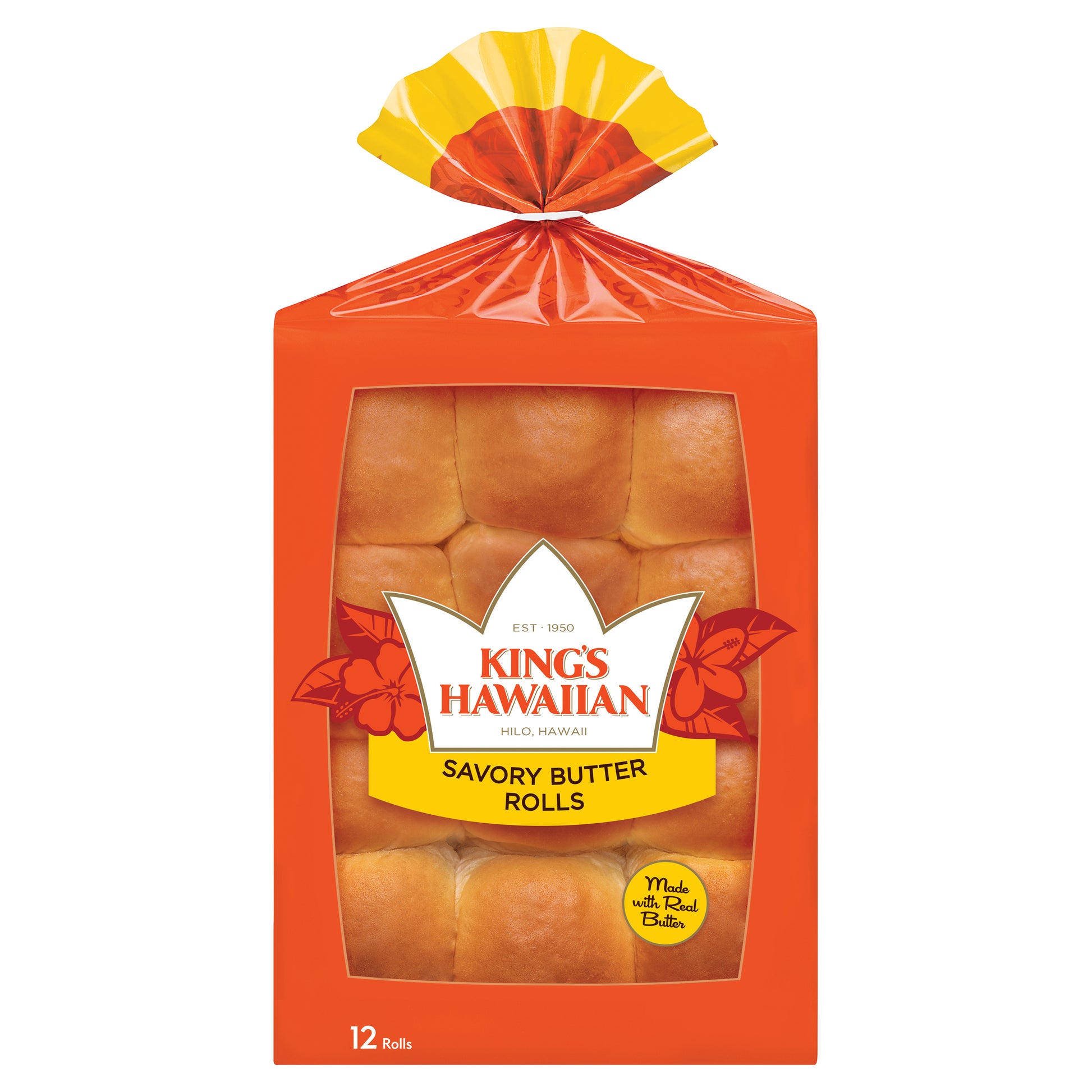 Made with real butter. Per 1 Roll Serving: 90 calories; 1.5 g sat fat (7% DV); 115 mg sodium (5% DV); 4 g sugars. No trans fat. Est 1950. No artificial dyes. Our Story: Back in the 1950s in Hilo, Hawaii, a man named Robert R. Taira had a passion for baking. He worked tirelessly to create a bread that was soft, sweet and irresistible. After years of making his bread in Hawaii, Robert decided to expand to the mainland. Today, the Taira family continues his legacy of creating irresistible products made with Aloha Spirit and enjoyed by millions. Mahalo, The Taira Family. Bring the party to life! Use our rolls to make crowd pleasing dishes like meatball sliders, ham and cheese sandwiches or even bread pudding. No high fructose corn syrup. www.kingshawaiian.com. Facebook. Pinterest. SmartLabel. Visit us online at: www.kingshawaiian.com. If you have any questions or comments, please email us at: khcares(at)kingshawaiian.com. Consumer Care: (877) My-Khcares; (877) 695-4227. Product of USA.