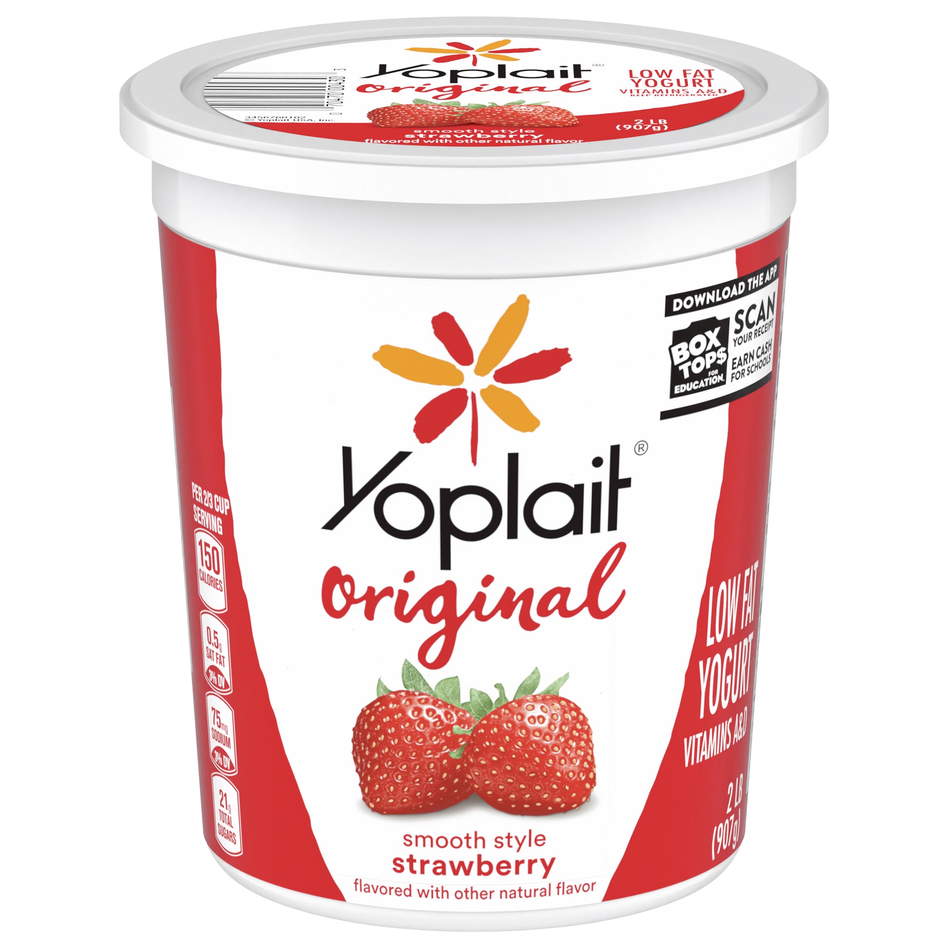 Yoplait Original Strawberry Yogurt Tub provides all the delicious low fat yogurt you need when one cup just isn't enough. At 150 calories per serving, this smooth-style strawberry yogurt offers a creamy texture and a great taste to make snacks and breakfast on the go more delectable. Yoplait Original Yogurt is made with live active cultures, real fruit and yogurt with no artificial flavors, no high fructose corn syrup and no colors from artificial sources. This smooth yogurt is a good source of calcium, vitamin A and vitamin D, making it a flavorful complement to your favorite healthy snacks. Open this low fat, gluten free yogurt container and enjoy it as breakfast food or as a yogurt snack any time of the day. This flavored yogurt tastes great on its own and it's the perfect ingredient for a refreshing yogurt smoothie, overnight oats or a delicious yogurt parfait. Store this 32-ounce yogurt tub in the refrigerator and keep cold until you’re ready to open and enjoy. Yoplait is a participating Box Tops product. Yoplait brings goodness to everyday moments, one serving of yum at a time.